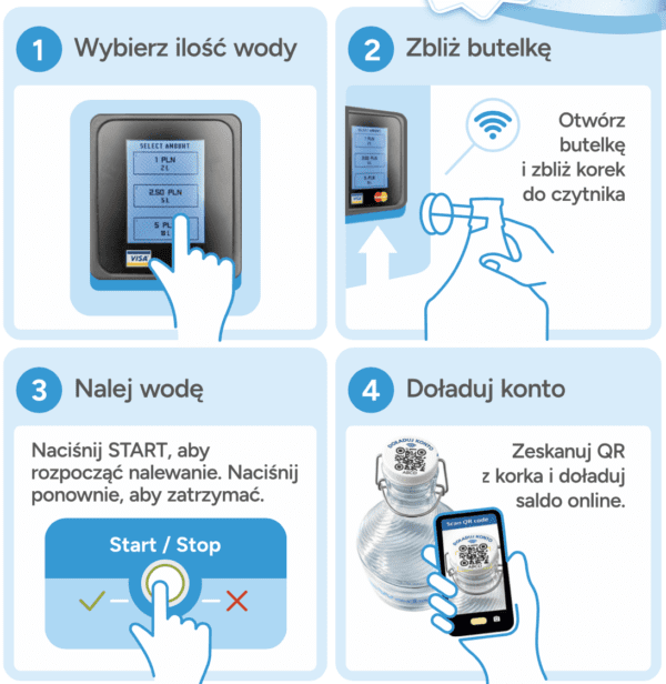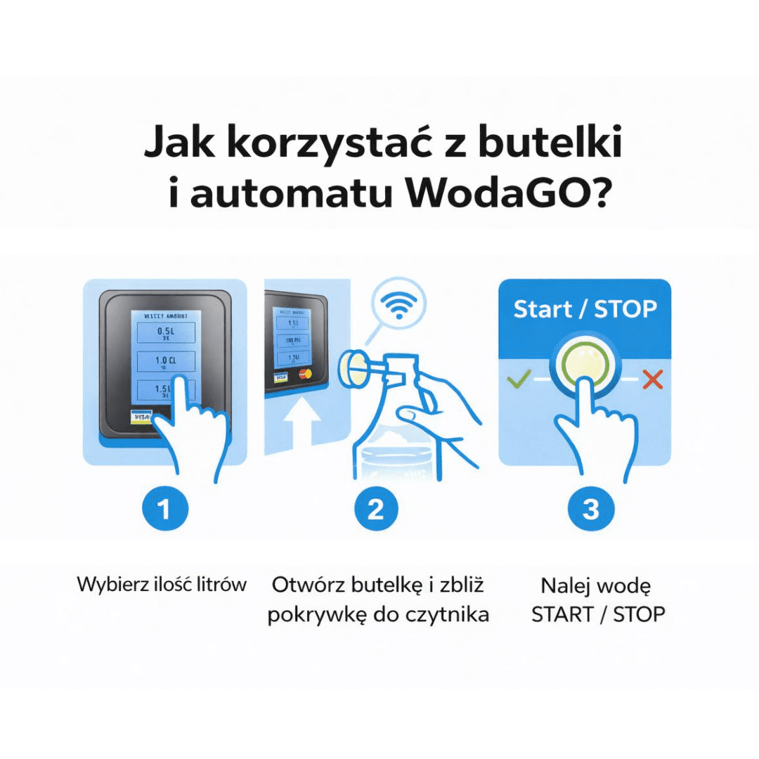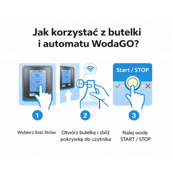 Wystarczy zbliżyć korek butelki do czytnika, aby aktywować dostęp. Inteligentna technologia sprawia, że codzienne uzupełnianie wysokiej jakości wody pitnej jest wygodne, szybkie i nowoczesne. Korzystanie z systemu WodaGO SMART to sposób na tańszą wodę pitną oraz realne ograniczenie zużycia plastiku.